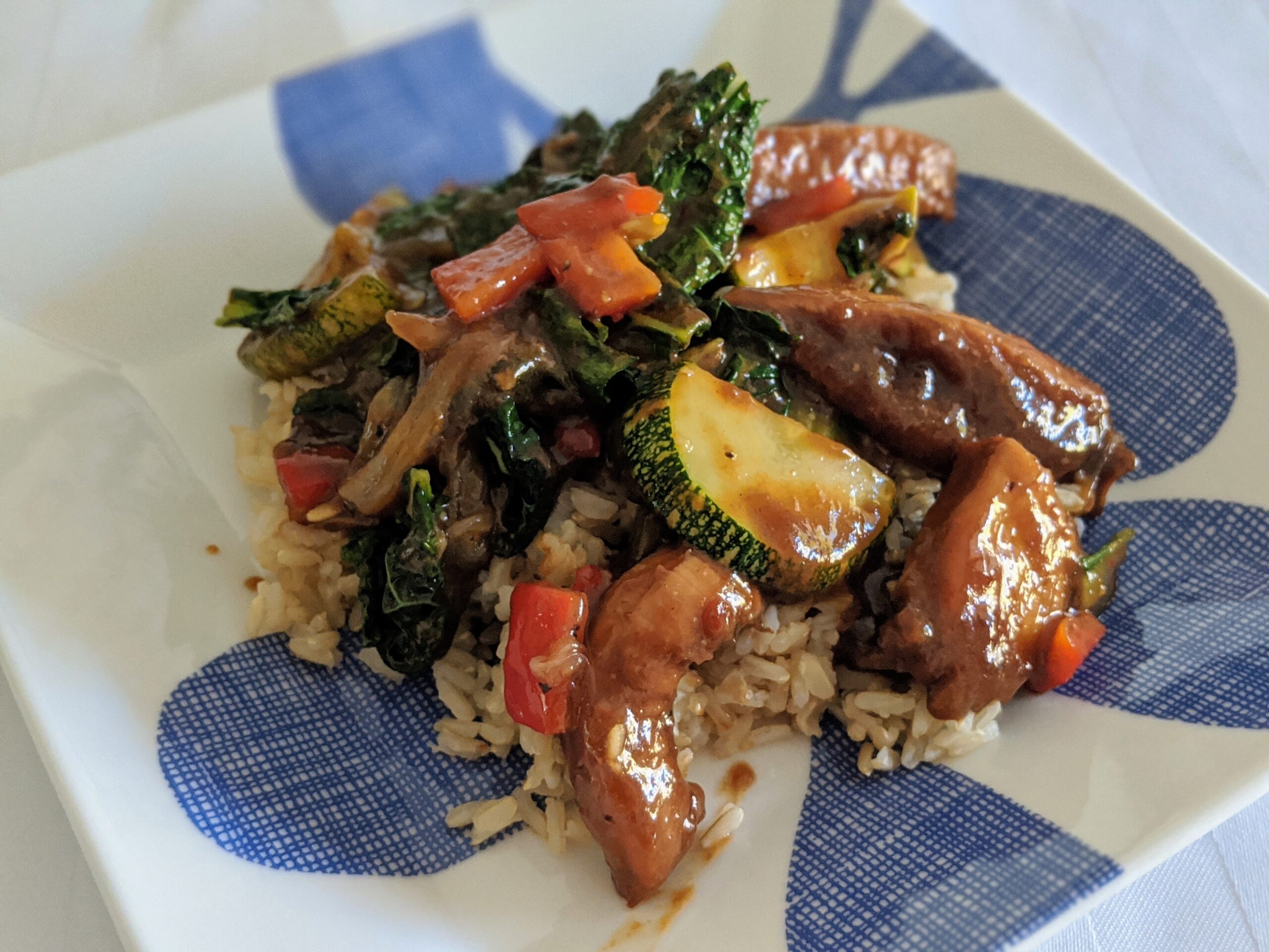 - When vegetables and chicken are done, 2 serving options:1. Over cooked brown rice, layer vegetables and chicken2. Mix vegetables, chicken, and marinade together, then serve over brown riceServe 1/2 cup brown rice, 1/2 cup chicken, and about 1 cup vegetables per serving