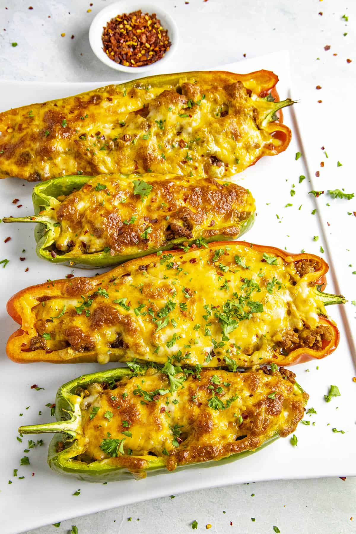 This taco stuffed peppers recipe is loaded with flavor – large sweet bell peppers stuffed with taco seasoned ground meat then topped with melty cheese. Don't forget the hot sauce!Stuffed peppers! Did you know that we have a slight obsession with stuffed chili peppers? The stuffed chili pepper is a cause for celebration.This recipe uses the sweet bell pepper. We were at the local grocery store, working our way through the produce section, and these peppers leaped into the cart. I've also made this many times with larger sweet peppers grown in my home garden.They were begging to be stuffed. Since the holidays are arriving and we both need to hold back on the calorie intake in preparation for all the upcoming celebration eating, we opted for a lighter fare recipe this time.